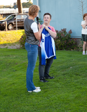 Op vrijdag 5 september reikten we de nieuwe jasjes officieel uit. Nadat er een gezellig interview plaats vond met Wesley van Klink ofwel Bennie. Hij schaatst al jaren met veel plezier op de ijsbaan in Leiden in een g-schaatsgroep.
